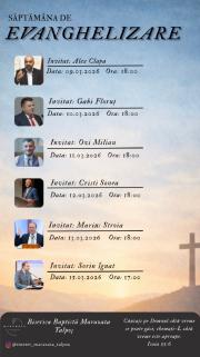 Biserica Baptistă Maranata din Talpoș vă invită cu drag la o serie specială de întâlniri care vor avea loc în luna martie 2026. Aceste seri vor fi un timp de părtășie, închinare și vestire a Evangheliei, în care dorim să căutăm împreună prezența lui Dumnezeu și să ascultăm mesajul Său pentru viețile noastre.
