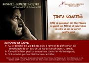 “ Organizaţia Creştină “Ecce Homo” desfăşoară în perioada 25 septembrie – 9 octombrie 2011 campania de ajutorare “Bunicii – semenii noştri” prin care un număr de 1200 pensionari cu pensii sub 400 de lei vor beneficia de câte un sac de 25 kg cu cartofi pentru iarnă. Vă invităm să vă alăturaţi campaniei noastre prin donaţii în bani, pentru acoperirea costurilor privind cumpararea cartofilor si distribuirea acestora. Orice donaţie din partea dumneavoastră contează! Pentru mai multe informaţii va rugăm să vă adresaţi la sediul Organizaţiei din str. Henri Barbusse nr. 43 (lângă Fabrica Farmec), tel 0264 437 179, e-mail: [email protected]. Pers. de contact: Mihaly Vincze."